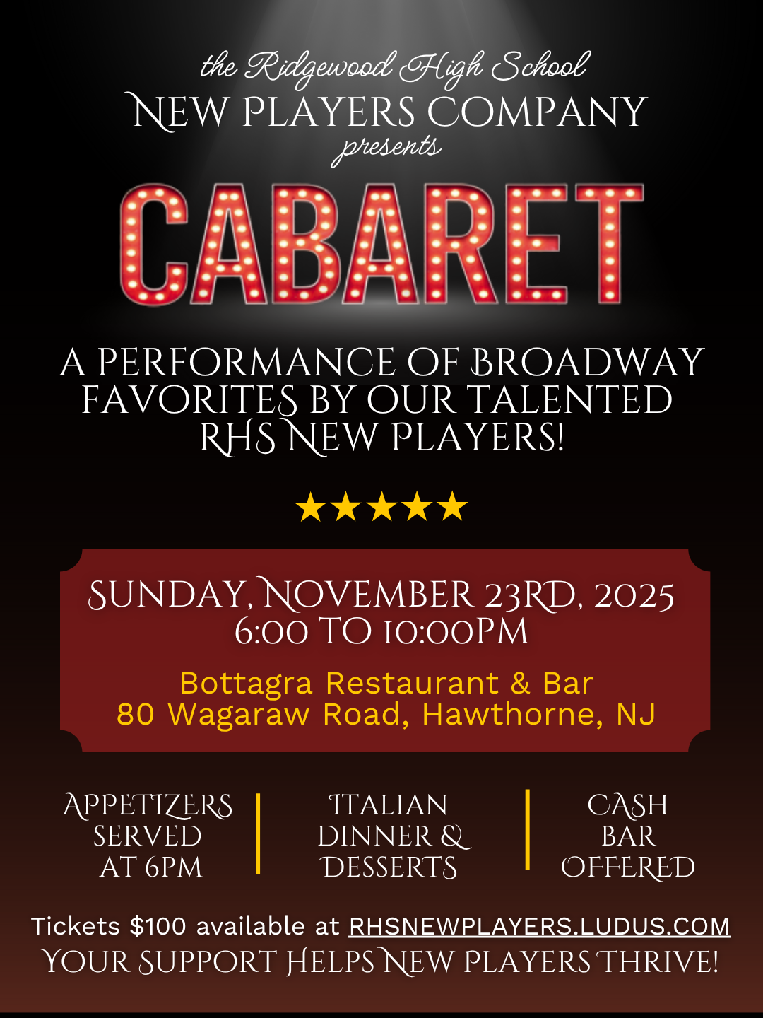 Organized and hosted by the New Players Association Board, Cabaret is our biggest fundraiser of the year! Students audition to perform Broadway selections in solos, duets, or small groups in an upscale Cabaret setting at a local restaurant. Usually held the Sunday before Thanksgiving, families, friends, alumni, and fans of New Players are invited to join this evening of food, drinks, and fabulous performances by our talented New Players!